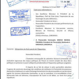 « Nous référant aux articles 18, 19, 20, 21, 22, 23 et 24 de la constitution portant statut de l’opposition, nous venons auprès de votre Autorité, sollicité la mise en route du processus de désignation du Porte-parole de l’opposition en tenant compte de la configuration politique du pays et des enjeux électoraux du moment », peut-on lire la lettre signée par Me Contant Mutamba.