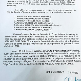 La Banque Centrale du Congo (BCC) informe cependant, le public, les actionnaires, les administrateurs, les déposants à un titre d'un droit sur les fonds ou avoir conservés ou détenus par AFRILAND FIRST BANK CD S.A que le conseil d'administration et la direction générale de cette banque sont dessaisis de leurs pouvoirs de gestion, à dater de ce jour, peut on lire de cet avis au public.